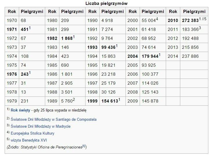 Początki kultu religijnego w Santiago sięgają IX wieku. Przybycie pierwszego udokumentowanego pielgrzyma, francuskiego biskupa Le Puy Godescalco, datuje się na rok 950. Ślady pielgrzymek z IX wieku znajdujemy na monetach Karola Wielkiego, jednak największe nasilenie ruchów pielgrzymkowych przypada na wiek XI–XIV. W wieku XII akt papieski uznał Compostelę za trzecie po Jerozolimie i Rzymie miejsce święte chrześcijaństwa. Wówczas Santiago stało się na równi z Rzymem i Jerozolimą jednym z trzech najważniejszych miejsc pielgrzymkowych zachodniej Europy. Pojawia się nowa terminologia: pątnika udającego się do Santiago zaczyna się nazywać peregrino, tak jak swą nazwę miał pielgrzym udający się do Rzymu (romero) czy Jerozolimy (palmero). Pielgrzymów do grobu apostoła nazywano również kokijardami (od francuskiej nazwy muszli: la coquille)[1].
