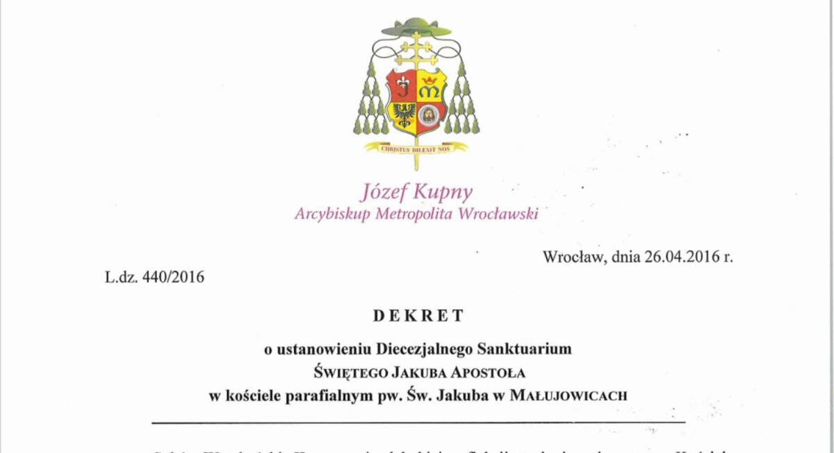 Dekret o ustanowieniu Diecezjalnego Sanktuarium Świętego Jakuba Apostoła w kościele prafialnym pw. Św. Jakuba w Małujowicach, podpisany przez Arcybiskupa Metropolity Wrocławskiego.