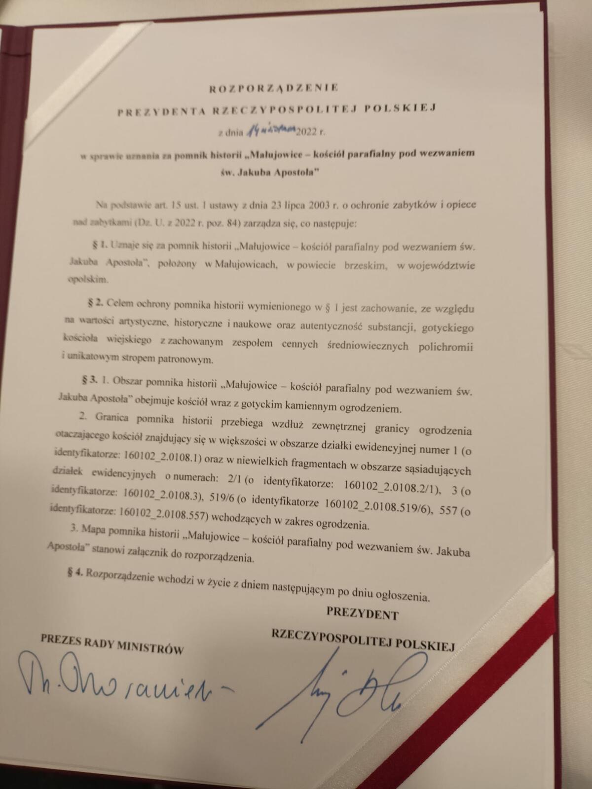 Uroczystość wręczenia roporządzenia uznającego kościół parafialny w Małujowicach pod wezwanie św. Jakuba Apostoła za pomnik historii.